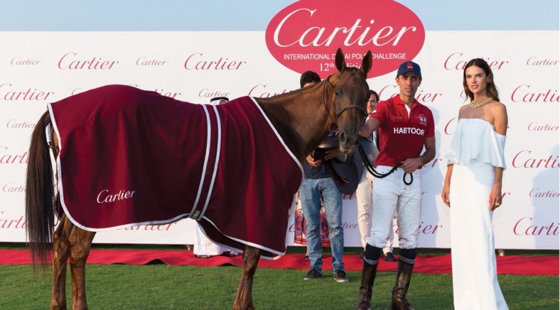 DUBAI, UNITED ARAB EMIRATES – NOVEMBER 05: Mohammed Al Habtoor, patron of Habtoor Polo team and Alessandro Ambrosio, with the best playing pony, after the final day of the Cartier International Dubai Polo Challenge at Desert Palm Hotel on November 5, 2016 in Dubai, United Arab Emirates. (Photo by Neville Hopwood/Getty Images) *** Local Caption *** Mohammed Al Habtoor;Alessandro Ambrosio
