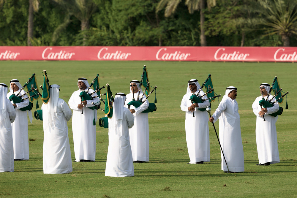 DUBAI, UNITED ARAB EMIRATES – NOVEMBER 05: An Emirati bagpipe band plays for guests during the final day of the Cartier International Dubai Polo Challenge at Desert Palm Hotel on November 5, 2016 in Dubai, United Arab Emirates. (Photo by Neville Hopwood/Getty Images) *** Local Caption *** Cartier International Dubai Polo Challenge