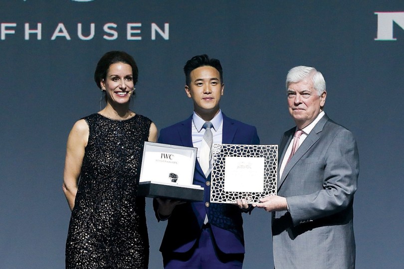 BEIJING, CHINA – APRIL 18: At the 2017 Beijing International Film Festival, IWC Schaffhausen hosted an exclusive “For the Love of Cinema” gala dinner to celebrate the achievements of young Chinese filmmakers. Motion Picture Association President, Christopher Dodd (R), presented the IWC Outstanding Young Filmmaker of the Year Award to winner Derek Tsang (C) and IWC Chief Marketing Officer, Franziska Gsell, presented him with an IWC Portugieser Automatic (ref. IW500703). (Photo by Lintao Zhang/IWC Schaffhausen via Getty Images) *** Local Caption *** Christopher Dodd; Derek Tsang; Franziska Gsell