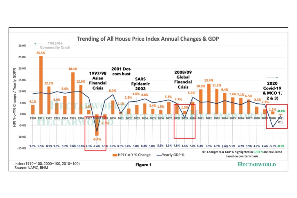 As shown in Figure 1 above, the Asian financial crisis struck our country in 1997 and the market did badly in 1998 at – 9.4% GDP Growth, but recovered almost immediately in 1999 at 6% GDP Growth. Similarly, the Subprime mortgage crisis in 2008 saw the market plunged in 2009 and again positively recovered by 2010 onward. During early 2020, Covid-19 pandemic hit our country and the GDP Growth started to decline at about -0.4% to -0.5% at Q1 2021 and expected to stay sluggish throughout 2021 due to the implementation of Full Movement Control Order (FMCO). Positive recovery is expected in 2022 when new normal is restored and the health crisis is brought under control through herd immunity.