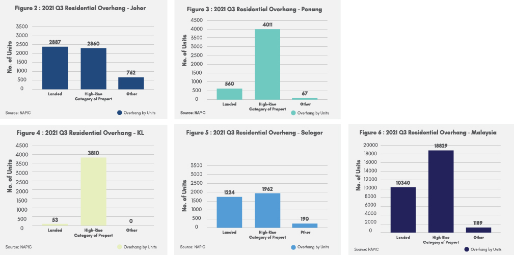 The supply overhang remains a concern to most Malaysians in general as according to the National Property Information Centre (“NAPIC”) data in Figure 1 below, a total of 30,358units of completed houses were reported unsold in the third quarter (Q3) of 2021, and by state with reference to Figure 2, 3, 4 and 5 respectively, Johor has the highest number of unsold units(21 per cent share) in Malaysia, followed by Penang (15 per cent), Kuala Lumpur (13 per cent) and Selangor (11 per cent).
