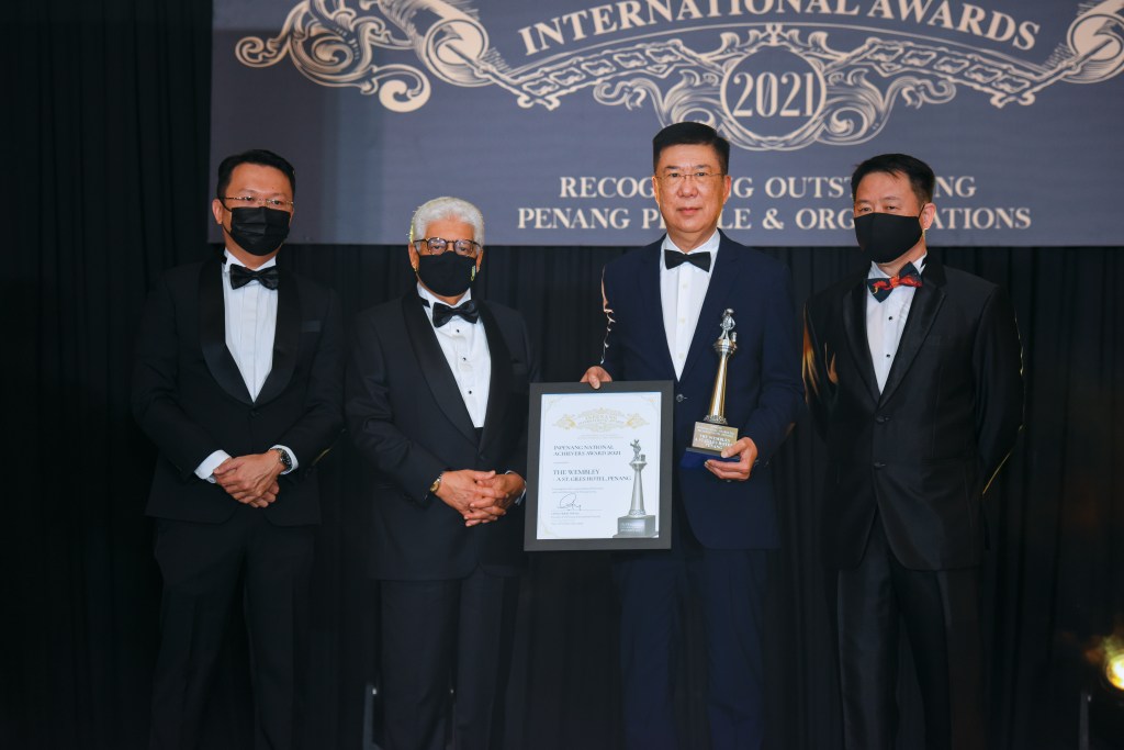 A proud moment: Mr Tony Goh (2nd from right) receiving the INPenang National Award for Preferred Hotel on behalf of The Wembley – A St Giles Hotel, Penang, from the Governor of Penang, TYT Tun Dato’ Seri Utama Ahmad Fuzi bin Haji Abdul Razak (2nd from left) at the INPenang International Awards 2021 presentation ceremony. Looking on are: (L) YB Yeoh Soon Hin, Penang State EXCO for Tourism and Creative Economy (PETACE) and Dato’ Chng Huck Theng, President of CHTNetwork (R)