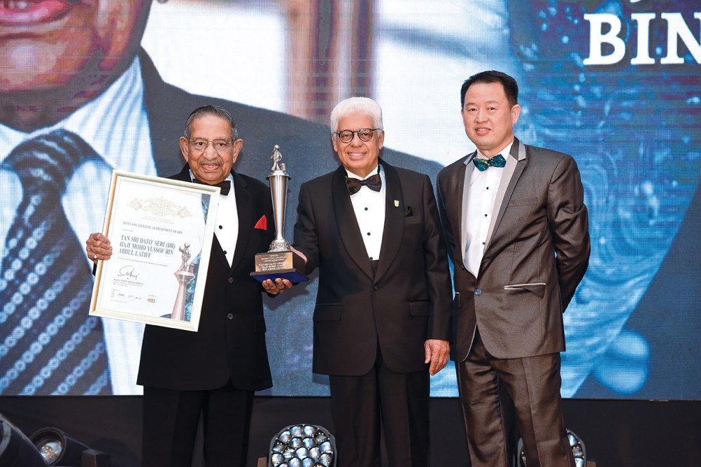 Tan Sri Dato’ Seri (Dr.) Haji Mohd Yussof Latiff (left) receiving the INPenang Lifetime Achievement Award from TYT Tun Dato’ Seri Utama Ahmad Fuzi bin Haji Abdul Razak at the INPenang International Awards 2023 presentation ceremony, accompanied by Dato’ Chng Huck Theng (right), Founding President of CHT International Awards.
