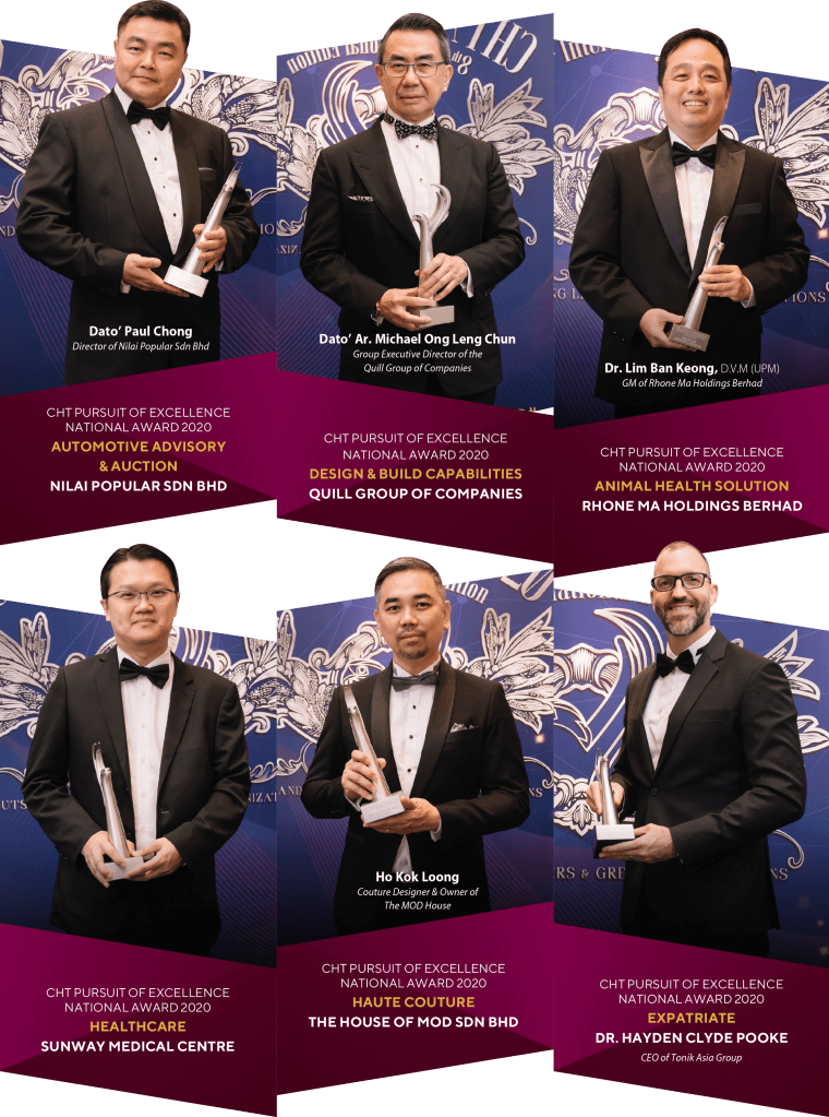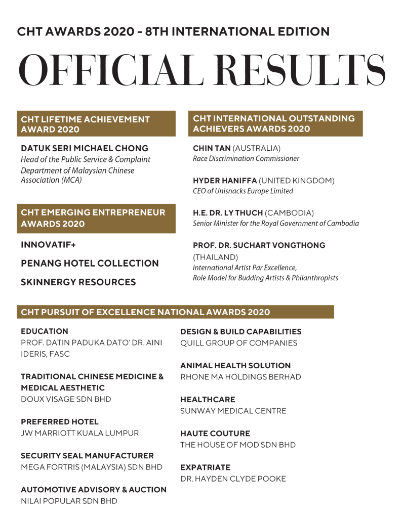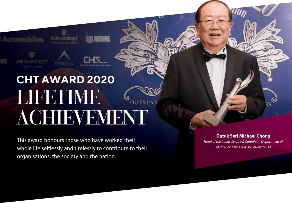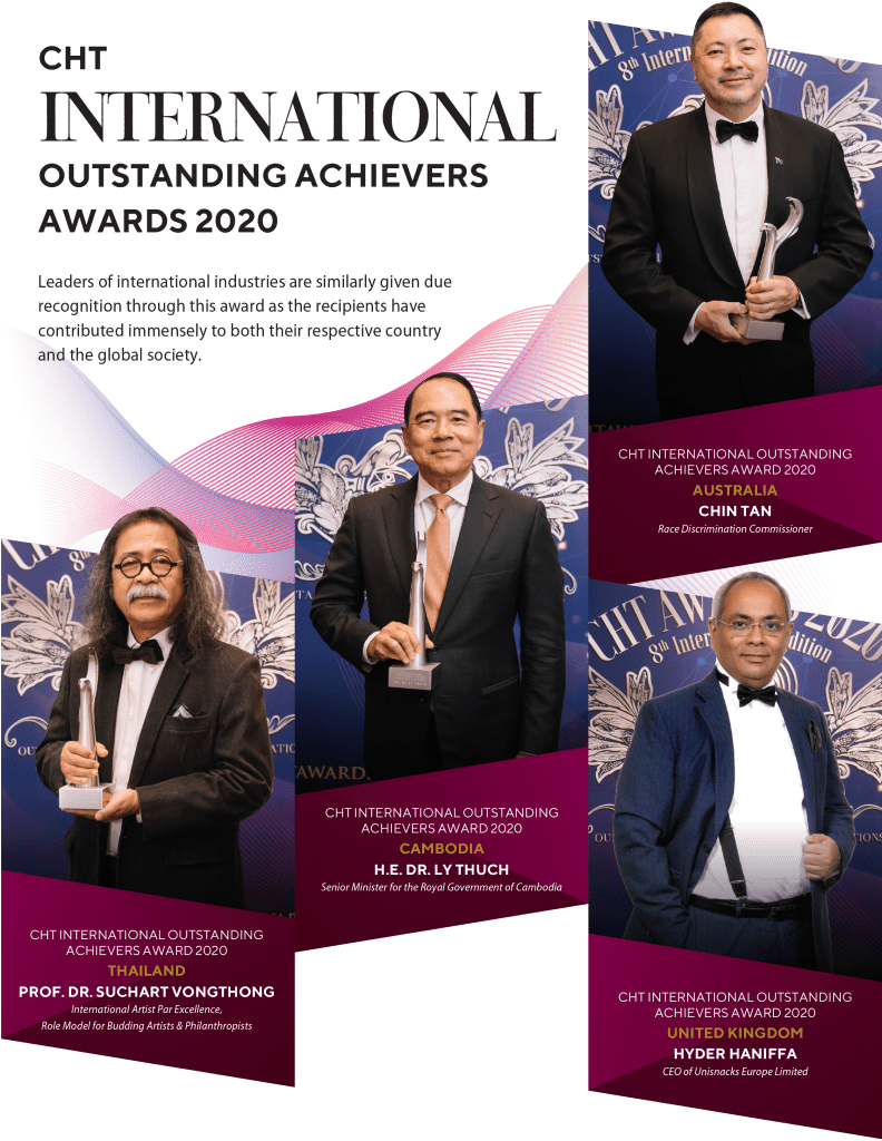 The evening started off with the presentation of the 3 CHT Emerging Entrepreneur Awards. This is an award to recognize the young and upcoming entities that have shown great potentials in establishing themselves in the market. The three winners were Skinnergy Resources, PHC (Penang Hotel Collection) and Innovatif+. Next, 10 established leaders and organizations were awarded the CHT Pursuit Of Excellence Awards for achieving success in their respective industries and their contribution to the society. Among the prestigious awardees were Rhone Ma Holdings Berhad, Quill Group of Companies, Sunway Medical Centre, Doux Visage Sdn Bhd, Mega Fortris (Malaysia) Sdn Bhd, JW Marriott Kuala Lumpur, The House of MOD Sdn Bhd, Nilai Popular Sdn Bhd, Prof. Datin Paduka Dato’ Dr. Aini Ideris and Dr. Hayden Clyde Pooke. The CHT International Awards this year was awarded to some very high profile individuals including the Senior Minister Of Cambodia H.E. Ly Thuch, Race Discrimination Commissioner Australia, Chin Tan and Thailand Royal Artist, Prof. Suchart Vongthong. Last but not least, the CHT Lifetime Achievement Award 2020 was awarded to Dato Seri Michael Chong, a person who is well known and highly respected in Malaysia who has spent decades handling and solving public complaints.