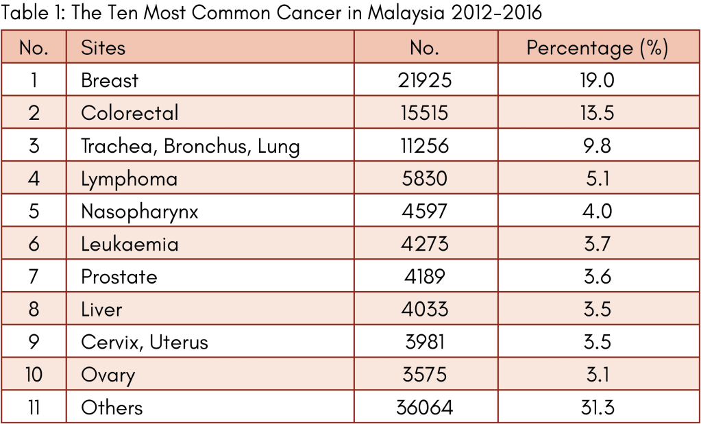 Data from the Malaysian National Cancer Registry Report (MNCRR) for 2012-2016 revealed a total number of 2,097 cases of brain BT among the Malaysians with 1,117 cases among males and 908 cases females, which ranked as 11th and 13th most common cancer among males and females respectively.