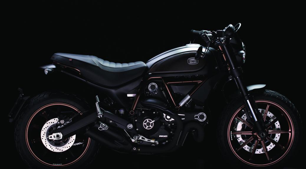 The Ducati Scrambler Italia Independent is each embellished with an aluminium plate laser marked with the bike’s serial number, features the Ducati Scrambler-Italia Independent logo and is characterised by fuel tank side panels and both the Night Copper-coloured frame and wheels.